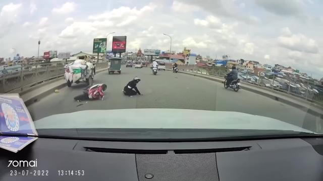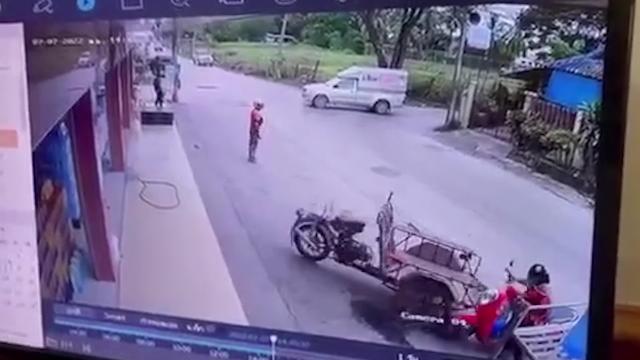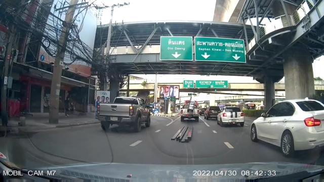 Motorist Peter Sunpit was terrified when he watched the construction materials stacked on top of the vehicle suddenly come loose and fall onto the road in Bangkok, Thailand on April 30. 2022-07-30 17:25:26