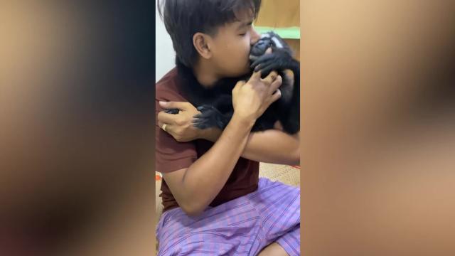 Footage shows the hoolock gibbon named Haw Haw clinging onto her owner Zwe Min Han, who had just come home from a two-day trip in Monywa City, Myanmar, on June 23. 2022-07-30 14:31:31
