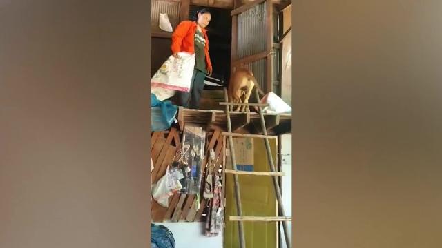 Video shows the dog named Coco, 5, carefully stepping on the ladder's rungs to meet his fur mum on the second floor of the house in Yasothon province, Thailand on June 29. 2022-07-30 14:34:29
