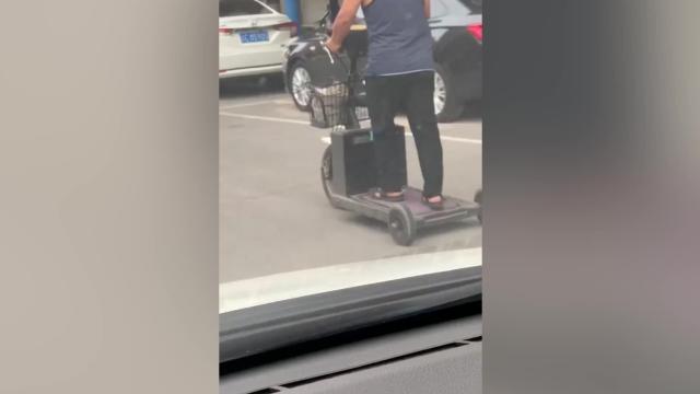 Footage shows the clever pensioner casually strutting on the belt of a treadmill which was fitted to a bicycle rolling down a road in Anshan City in Liaoning province on July 23. 2022-07-30 14:16:05