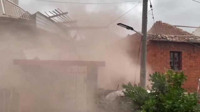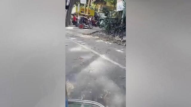 The magnitude 7 earthquake weakened foundations and left a building tilted dangerously next to a road in the town of Lagangilang in Abra province on July 27. 2022-07-27 16:57:57