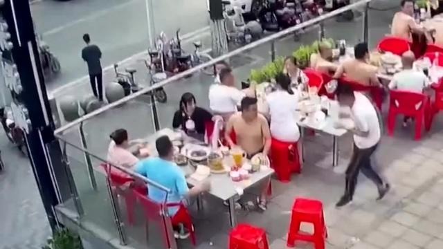 Video shows the chef flinging the flat piece of dough into the air in an outdoor dining area in Wuhan City, Hubei province on July 24. 2022-07-27 18:32:26
