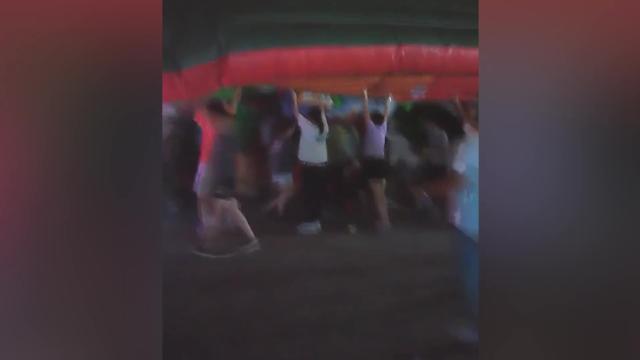 The youngsters were jumping around on the inflatable when a sudden rainstorm lashed the playground in Luohe City, Henan province on July 25. The gales reportedly upended the castle, pinning the kids underneath it. 2022-07-26 18:17:08