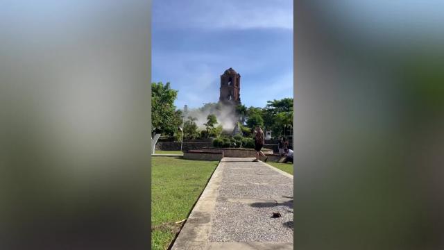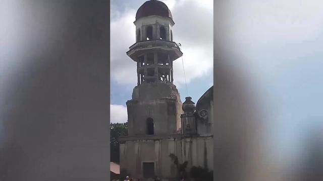 Footage taken by a resident shows a large crack on the entrance of the Santa Catalina de Alejandria Parish Church in Tayum, Abra on July 27. Its bell tower was also visibly damaged. 2022-07-27 13:22:52