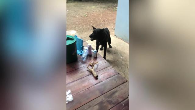 Footage shows the black pooch eyeing a tiny blue mirror on the table upon taking a glimpse of his reflection in Sa Kaeo province, Thailand on July 18. 2022-07-20 22:37:22