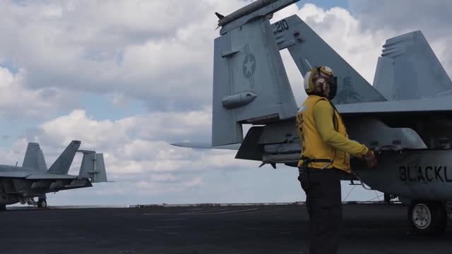 Footage shows the Ford-class aircraft carrier conducting flight operations on March 2, launching and recovering aircraft from its flight deck as part of the ongoing mission in the region. 2026-03-06 11:47:25