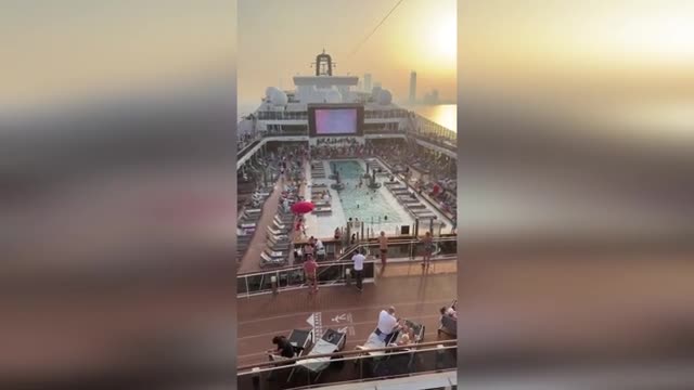 Footage filmed by Darren Lee aboard a cruise ship docked at Dubai Harbour shows holidaymakers strolling across the decks while others relax by the swimming pool. 2026-03-06 11:46:44