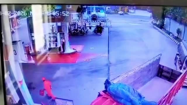 CCTV footage shows the out-of-control vehicle hitting a barrier before being thrown into the air and slamming into a fuel dispenser in Central Java. 2026-03-06 11:53:12