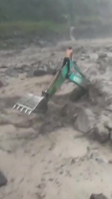 Dramatic footage shows the man clinging to the top of the heavy machinery to avoid fast-flowing, murky water in Central Java, Indonesia. 2026-03-06 11:51:49