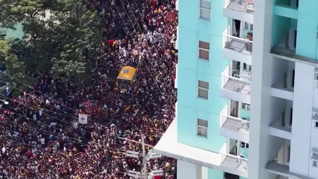 Aerial footage shows the moment worshippers crowded the 466ft (142m) Ayala Bridge as they inched towards Carlos Palanca Street on their way to Quiapo Church in the Philippine capital. 2026-01-12 14:22:10