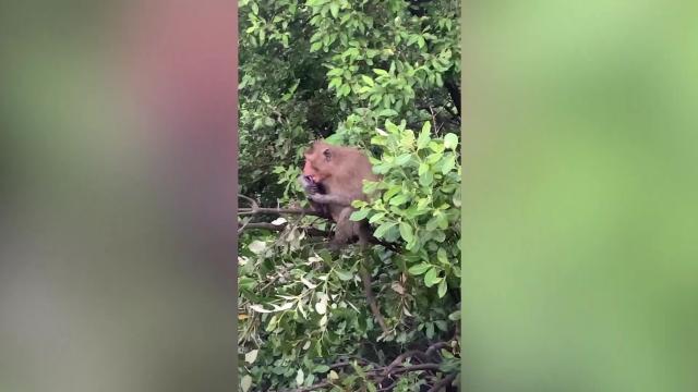 The long-tailed macaque emerged from the trees and jumped to steal a man's phone as he took snapshots of the beautiful scenery in Chon Buri province, Thailand on June 6. 2022-06-14 18:10:55