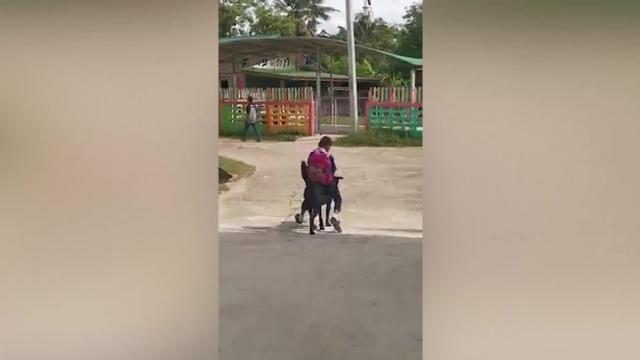 Adorable footage shows Yong, 9, straddling the black pooch named Chao Bo as they walked back home together in Chiang Rai province on June 8. 2022-06-14 18:07:58
