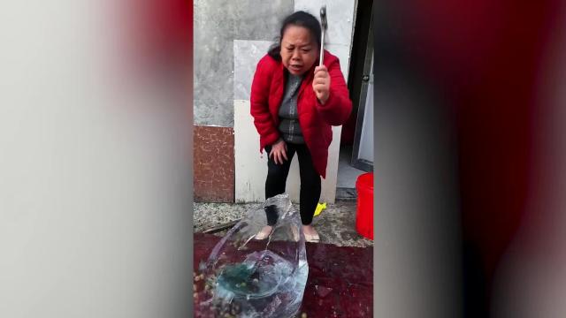 Footage shows the lady with the online handle 'Zhou mama loves laughing' squawking hysterically as she destroys the colourful frozen sculptures in Hunan, China. 2022-06-14 17:23:54