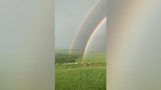 Footage shows the colourful arcs forming a clear, visible 'bridge' over a field in the town of Zhaosu in the Xinjiang region on June 6. 2022-06-14 14:41:58