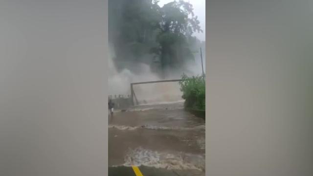 The swollen Lembah Anai Waterfall dumped water onto the Padang-Bukittinggi Cross Road in West Sumatra province on June 13, causing floods that blocked the area off to traffic. 2022-06-14 13:40:44