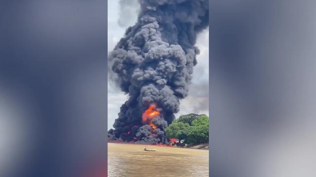 Footage shows the vessel burning up at the Chindwin River port in Monywa township at 9:00 am local time on July 10. A massive black plume of smoke rose up as the blaze reportedly razed more than 1,000 barrels of fuel onboard. 2022-07-12 14:51:42