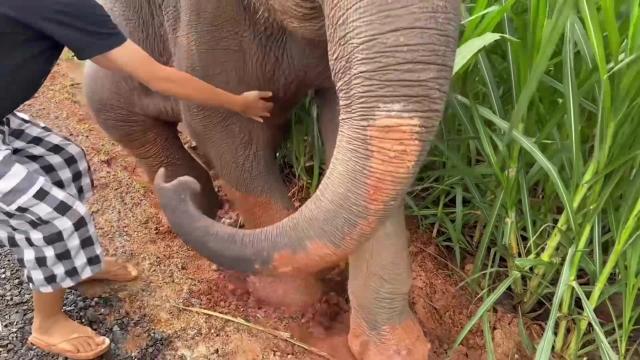 The juvenile jumbo named Suphansa was looking for food in a sugarcane field when he stepped on sludge in Surin province, Thailand on June 10. 2022-07-11 18:17:11