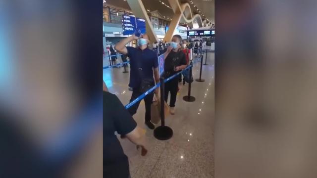 Footage shows passengers passing the bottle around to take a sip while checking their bags in at Changshui International Airport in Yunnan province on July 1. 2022-07-11 17:43:54