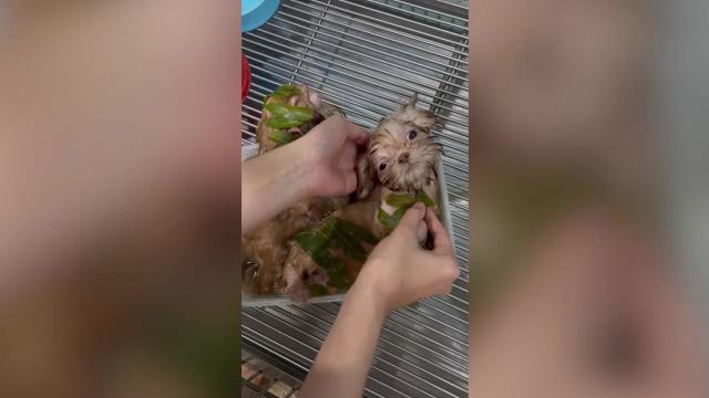 Footage shows the brown pooches sitting on a small basin filled with the warm herbal concoction in Bulacan province, the Philippines on June 3. 2022-07-11 18:11:08
