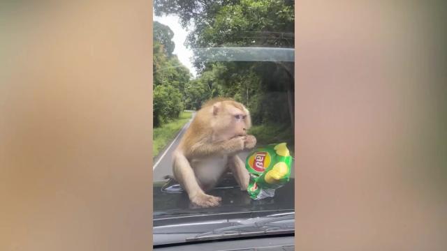 The hungry primate was filmed enjoying a bag of crisps while sitting in front of the windscreen of a vehicle driving along the Khao Yai National Park in Nakhon Ratchasima province on June 4.