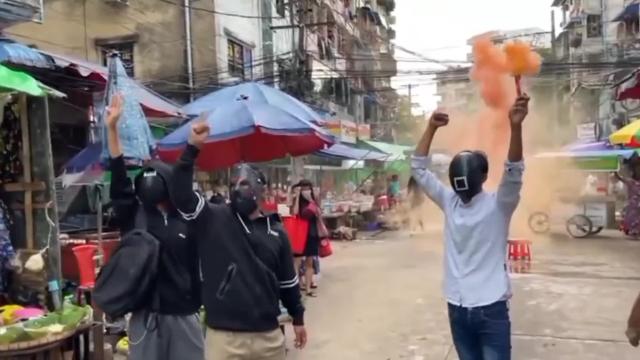 The masked demonstrators held up a coloured smoke flare as they declared their resistance against brutal military rule in Yangon City on June 26. While doing a three-fingered salute - a gesture of defiance activists have adopted from the film series 'The Hunger Games' - they shouted: 'We will never kneel down to your military boots!'