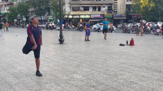 Footage shows the men playing jianzi, which originates from China, on the riverside in Phnom Penh on Friday June 24.