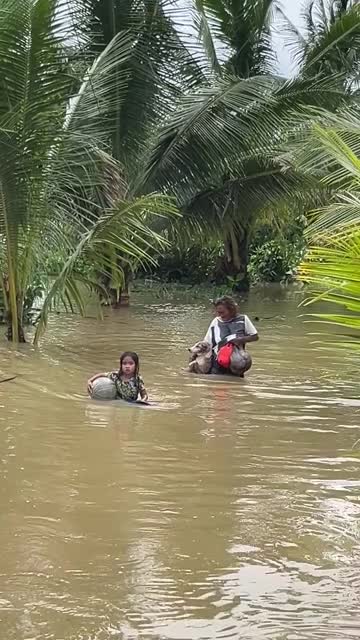 Mily Pahaganas was seen pulling her Aspin pooch as she waded through hip-deep murky water with her young neighbour, Trisha May Vertocio, in Cebu, the Philippines. 2025-11-10 13:26:45