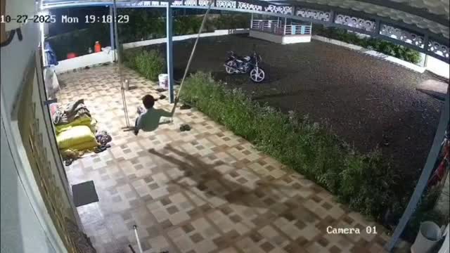 CCTV footage shows the youngster relaxing in the patio as the wild feline, which was chasing a white housecat, entered the compound in Pune, India. 2025-11-07 13:42:06