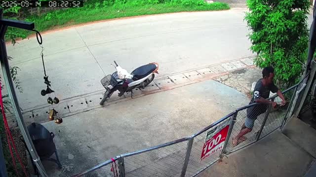 Hilarious CCTV footage shows Tarn, the brown canine, leaping back inside the compound while the man stood outside to buy an item from a shop in Khon Kaen, Thailand. 2025-10-22 13:27:02