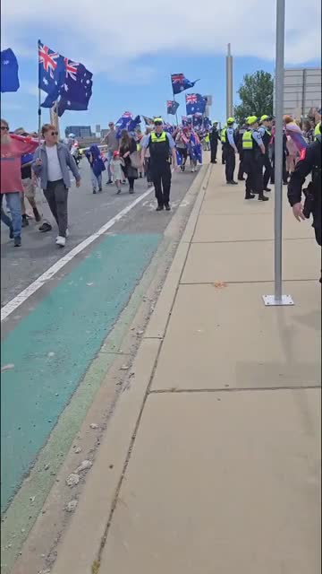 Footage shows demonstrators waving Australian and Southern Cross flags passing counter-activists carrying Palestinian, Aboriginal and communist flags, under close police supervision on Sunday. 2025-10-20 11:45:25