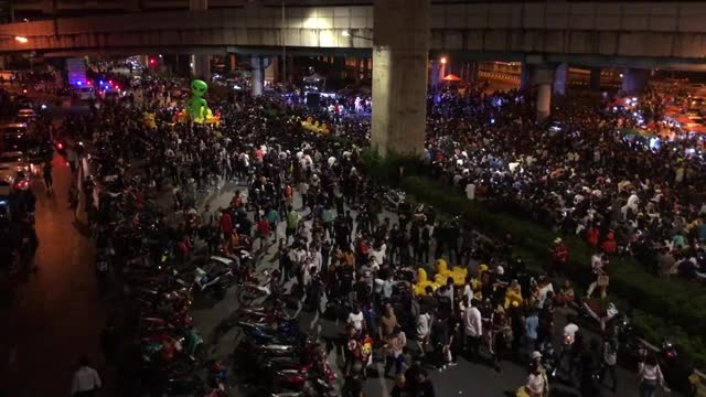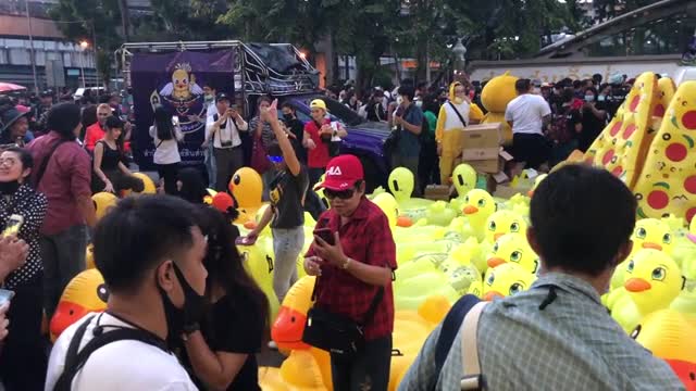 Protesters carry hundreds of inflatable yellow ducks at anti-government protest in Thailand