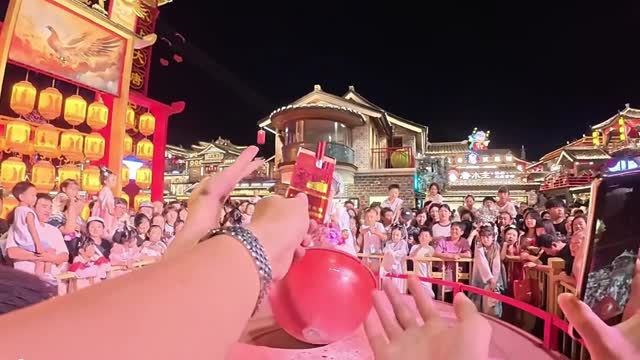 Point-of-view footage shows the spectator extending his arm to offer the red container to the performer, who was dressed in a flowing hanfu gown in Hebei, China. 2025-10-15 13:16:04
