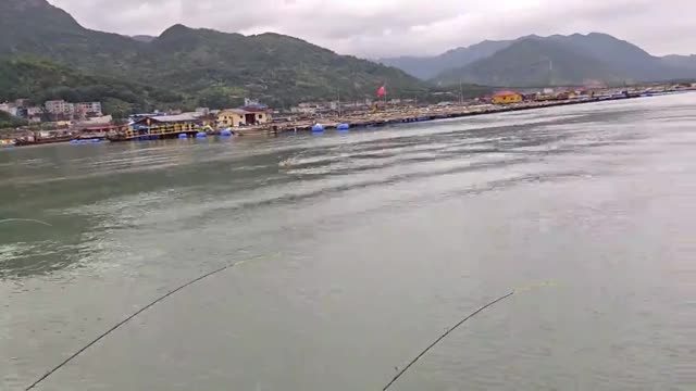 Mr Lian and his friends were fishing at Sandu Bay when the brown pooch swam through the high tide towards another canine standing on a fish raft in Fujian, China. 2025-10-15 13:32:37