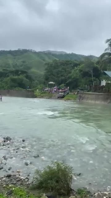 The public transport vehicle attempted to cross the strong current, only to lose balance and plunge into the water midway in Rizal, the Philippines. 2025-10-15 13:19:00