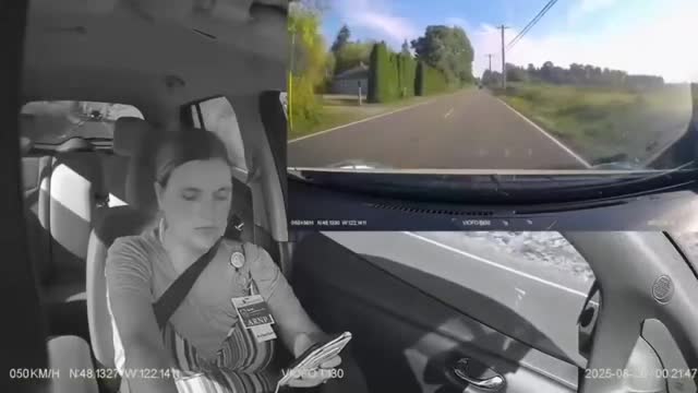Dashcam footage captured on a winding rural road shows the woman typing on her device with both hands while taking her eyes off the road in Madrid, Spain, on August 26. 2025-10-10 16:30:51