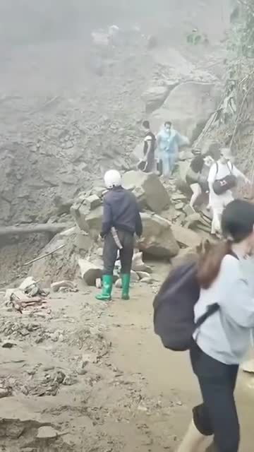 Footage shows holidaymakers cautiously crossing loose rocks and debris just moments before a surge of mud and debris tumbled down the slope at Khau Pha Pass in Mu Cang Chai District, Yen Bai Province.