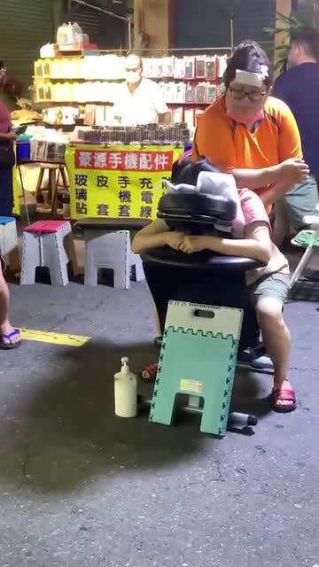 Footage shows the brown Shih Tzu leaning on the black massage chair, watching the therapist as she kneads her customer's back at Nanzi Night Market in Kaohsiung, Taiwan. 2025-10-03 13:33:40