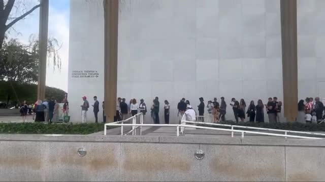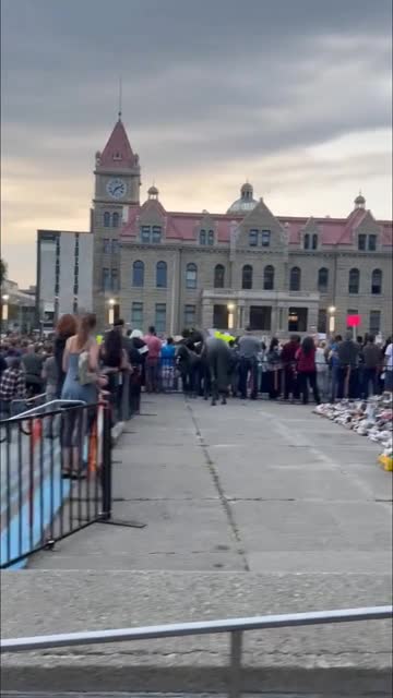 Footage shows a large crowd of supporters waiting outside, lining up to enter the building and attend the ceremony for the conservative commentator. 2025-09-17 13:18:49