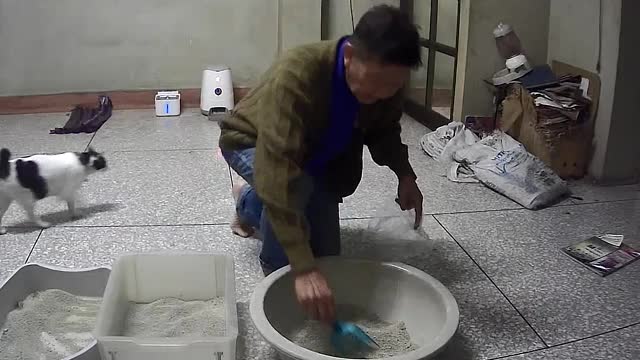 CCTV footage shows the grey tabby feline named Jiewliew leaping up the resident's back as he was scooping up dirt from the basins and putting them inside a plastic bag to throw away in Surin province, Thailand. 2025-09-17 02:00:00