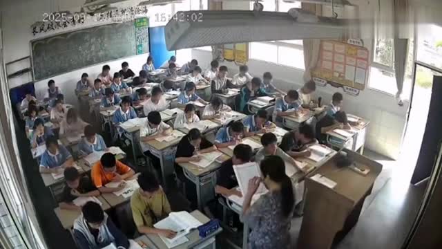 CCTV footage shows a teacher delivering a lecture and students listening attentively when tremors suddenly hit. They raised their heads in unison before ducking beneath their desks. 2025-09-17 13:17:45
