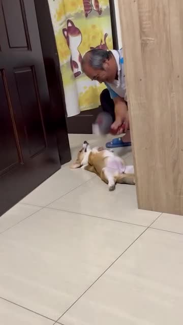 Footage showed the eight-month-old pooch named Puni spread-eagled on the tile as a grandfather gently tapped a sharp tool-shaped plushie on its stomach in New Taipei, Taiwan.