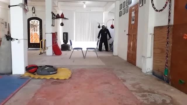 Footage shows Pete Lambert, dressed in a black dobok with a matching face covering, pacing back and forth, seemingly conditioning himself before delivering a midair strike in Chaguanas, Trinidad and Tobago. 2025-09-03 13:27:50