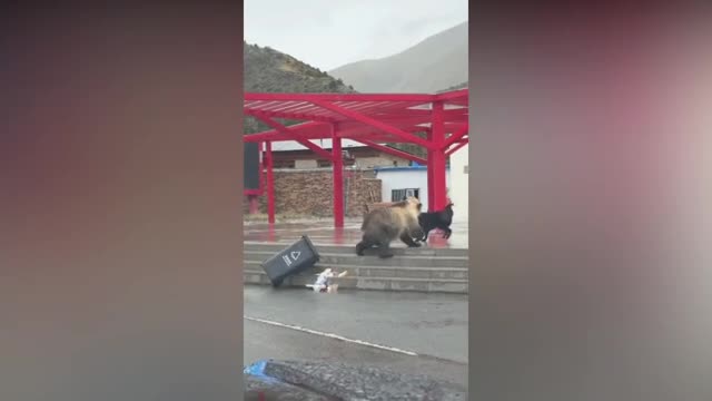 Tourists spotted the bear rummaging through trash cans when the visibly enraged canine attacked it at the Sapu Sacred Mountain Visitor Centre in Tibet, China. 2025-09-03 11:20:32