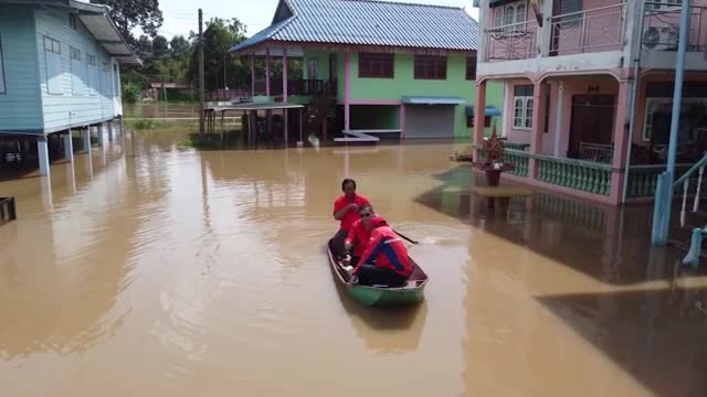 Employees from the Phichit Post Office rowed across the waist-deep deluge to deliver parcels to swamped homes along the swollen Yom River in Sukhothai province today. 2025-09-03 12:51:03