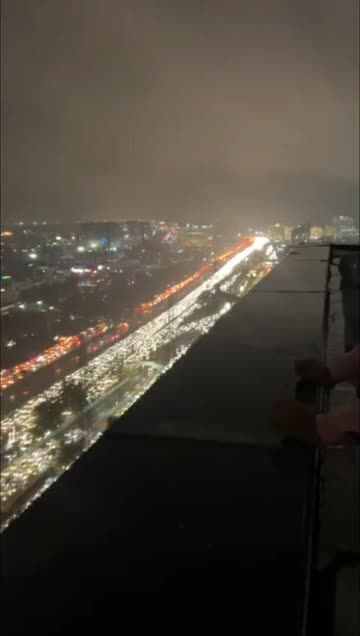 Footage captures a continuous line of vehicles crawling along the Delhi-Gurugram Expressway, their brake lights glowing in the rain-soaked evening, as commuters remained stuck in bumper-to-bumper traffic on September 1.