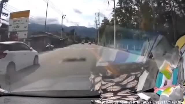 Terrifying footage shows a white truck travelling at high speed in the opposite lane, swerving to its left before violently colliding with a utility pole on Nong Ho Road in Chiang Mai. 2025-09-16 11:26:37