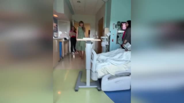CCTV footage shows a young woman approaching a room when an employee suddenly pushes the door open, accidentally striking her and sending her stumbling backwards. 2025-06-18 17:37:05