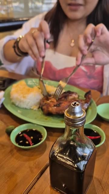 Footage shows Nes using stainless steel cutlery to slice bite-sized pieces from the breast part at a fast food restaurant in Manila, the Philippines. 2025-06-18 13:01:20