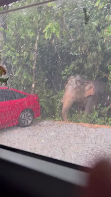Footage shows the jumbo named Plai Phi Diao appearing from a dense patch of trees and vegetation along the highway in Nakhon Nayok province. 2025-06-18 13:00:28