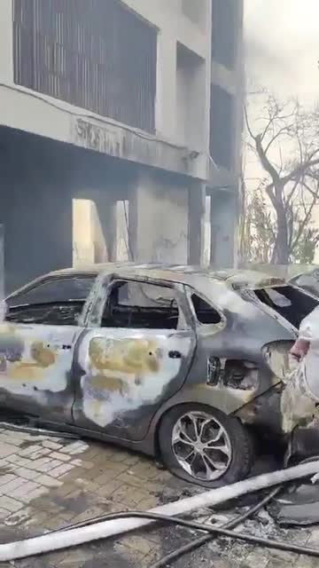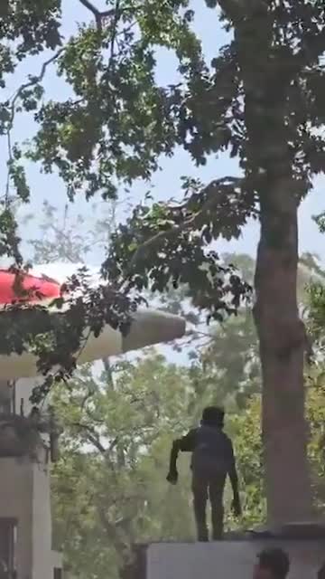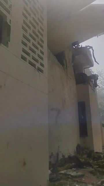 Air India plane crash wreckage hangs from building